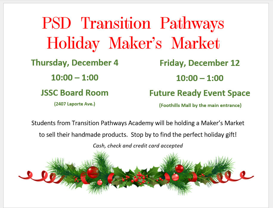 Students from Transitions Pathway Academy will be holding a Maker’s Market to sell their handmade products. Stop by and find the perfect holiday gift!